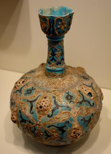 Keywords: Bottle, Iran, Rayy, Seljuk period, 13th century AD, earthenware with pierced gilt bosses and black paint over turquoise glaze - Cincinnati Art Museum - DSC03993.JPG en Exhibit in the Cincinnati Art Museum Cincinnati Ohio USA This artwork is in the public domain because the artist died more than 70 years ago Photography was permitted in the museum without restriction 2013-05-14 11 14 33 own Daderot cc-zero Uploaded with UploadWizard Seljuk pottery in the Cincinnati Art Museum Ceramics of Iran |