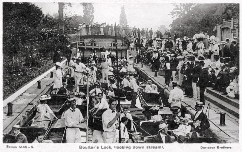 | Keywords: Boulter's Lock punts Maidenhead, Berkshire, England.jpg Edwardian punts in Boulter's Lock Maidenhead Windsor and Maidenhead Berkshire England 1901 - 1911 Beyond the lock is the entrance to the River Thames Just beyond the pedestrian bridge at the top of the photograph is today's bridge on Mill Road the road of the nearby home of the later and late television presenter and correspondent Richard Dimbleby CBE whose blue plaque is on the bridge 2016-01-11 19 20 44 Vintage postcard 1901 - 1911 Image trimmed to remove damaged edges Photographer not identified Publisher Davidson Brothers London; publishers of postcards comics greetings cards and artwork reproductions from 1901 to their winding-up in 1911 other versions Further historic images of Boulter's Lock </br> 50px 95px PD-old-70-1923 Boulter's Lock Uploaded with UploadWizard Punts People of the Edwardian era Footbridges in Berkshire Postcards of Berkshire Straw boaters |