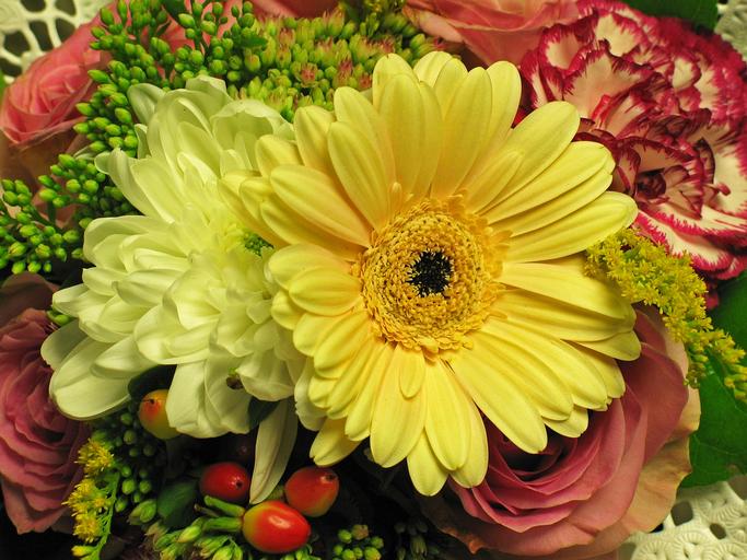 | Keywords: bouquet chrysanthemum nature flowers decorative roses white roses decoration festivity blum tight binding garden petals birthday congratulations gift give away birthday bouquet bloom flower vase valentine's day thank you celebration schnittblume gerbera bright yellow floristry joy background give congratulate mood |