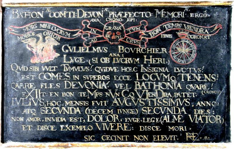 | Keywords: BourchierAnagramChronogramEpigram1623TawstockDevon.JPG Inscribed tablet on base of monument to William Bourchier 3rd Earl of Bath d 1623 St Peter's Church Tawstock Devon It comprises separate elements of anagram chronogram and epigram Top Bathon i ae Com i ti Devonae praefecto memoriae ergo To the memory of the Earl of Bath therefore to the prefect i e Lord Lieutenant of Devon Beneath this line is in the centre an inscribed skull and crossbones with to its left the image of a phoenix rising from a fire above which is Morior Orior I am dead I shall arise above which is inscribed on a scroll the well-known Roman epithet Mors mihi lucrum Death to me is reward On the right side of the skull is an image of a circular dial inscribed around the circumference with the first two letters of the 12 months of the year The top-most month which is crowned is IV i e JU for July the month of his death Above is inscribed Finis Coronat the end crowns above which is inscribed on a scroll the French motto of Bourchier Bon temps viendra The right time will come Within the skull is written on the top line grama to which word three other words point from above the skull ana- chrono- and epi- all Greek words in Latin form These denote to the reader the presence of anagrams chronograms epigrams and other puzzles within the tablet In the skull below the word grama are the two Latin words se and pul and on the two bones which intersect behind the skull are written 4 more Latin words ad in tum and crum which may all be combined together to form the sentences in sepulcrum ad sepultum into the grave in order to be buried or in sepultum ad se pulcrum in the act of burial one's-self is made beautiful Below is the anagram on the top line the words Gulielmus Bourchier William Bourchier below which is the indicator ana- and the name's Latin anagram Luge si ob lucrum heri mourn if on account of the profit of yesterday Below is a Latin epigram with some words in capitals which may relate to a chronogram or other word-game Quid sibi vult tumulus quidve haec insignia luctus est comes in superos ecce locumo tenens quare fles Devonia vel Bathonia quare If you wish to know what is this pile or why this great mourning the Earl behold is above as place-holder lieutenant as weeps Devon and Bath Below is a chronogram eXIIt en bon teMps nVnCo VIenDra patet exiit en bon temps nunc o viendra patet a mixture of limited sense in Latin and the French motto of Bourchier meaning he went in good time now he shall come he seeks When the capital Roman numerals are added together individually they make 1 623 the year of his death Underneath is a further possibly criptic epigram with some words in capitals Julius hoc mensis fuit Augustissimus anno atq ue secunda decem junge secunda dies non amor invidia est dolor euge lege alme viator et disce exemplo vivere disce more sic cecivit cecidit not elevit translated as The month of July was the most august in this year and the following day is hatred not love well-done read O Traveller and teach by his example how to live teach how to die thus he has falled he has not arisen At the end are two monograms R E and AR own photo 2013 Lobsterthermidor <span class signature-talk >talk</span> 18 13 26 March 2013 UTC St Peter's Church Tawstock interior Chronograms in writing in England PD-old-100 Earls of Bath |
