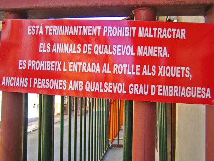 | Keywords: Bous al carrer prohibició.jpg Notice forbidding mistreatment of the bull and drunkeness during the bull-running festivities in El Verger county Marina Alta Region of Valencia Spain Avís que prohibeix el maltractament del bou durant les festes dels bous al carrer El Verger marina Alta País Valencià Own 2008-09-19 Espencat Running of the Bulls in Spain El Verger Catalan inscriptions Signs in the Land of Valencia | ||||