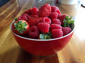 Keywords: bowl of berries berries strawberries raspberries strawberry berry summer fruit healthy vitamin juicy freshness bowl raspberry wooden eating delicious organic red