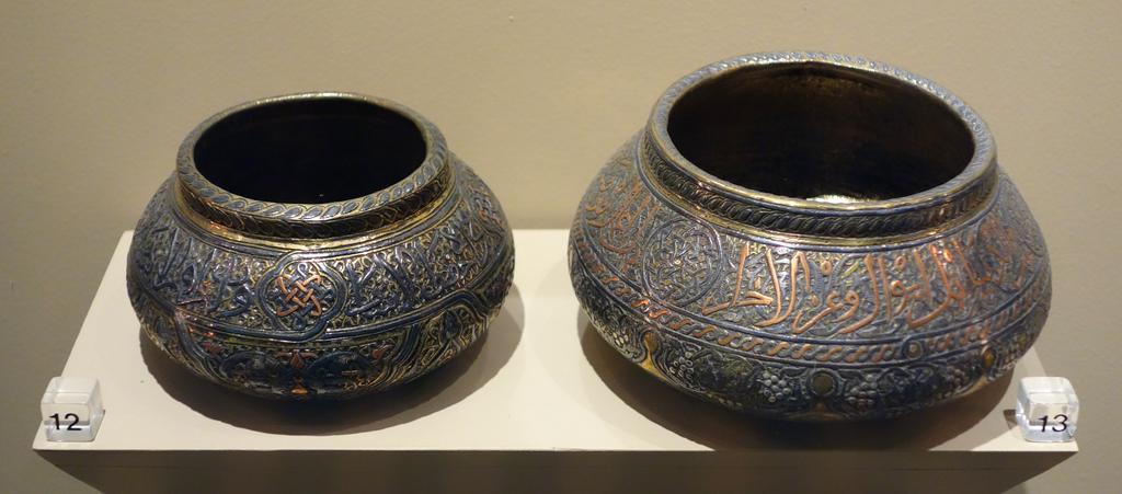 Keywords: Bowls with bands of calligraphy and medallions, Egypt or Syria, 19th century AD, brass with copper and silver inlay - Huntington Museum of Art - DSC05057.JPG en Exhibit in the Huntington Museum of Art Huntington West Virginia USA Photography was permitted in the museum without restriction This artwork is in the public domain because the artist died more than 70 years ago 2013-05-16 14 02 57 own Daderot cc-zero Metalwork in the Huntington Museum of Art Uploaded with UploadWizard Mamluk metalwork |