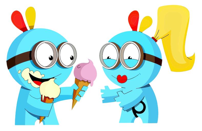 Keywords: boy caring cartoon characters critters cute female friendship girl ice cream male mutual affection non-human beings sharing