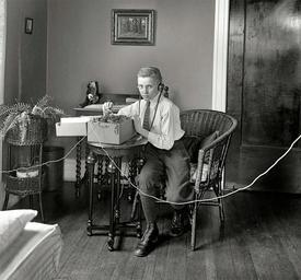 Keywords: boy device headphones black and white telegraph phone