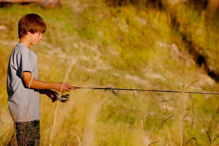 Keywords: boy fishing patience little boy casting nature outside river recreation fall autumn