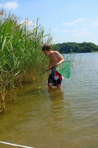 Keywords: boy fishnet fish reed natural water nature clouds blue sky landscape bright