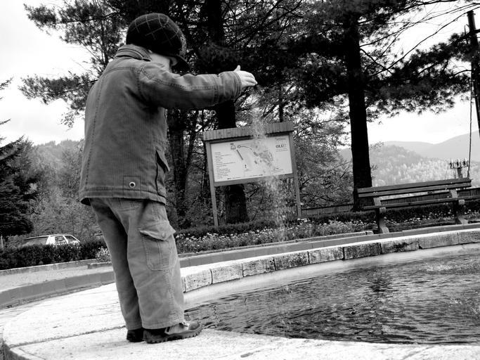 Keywords: boy one child water sand trees park