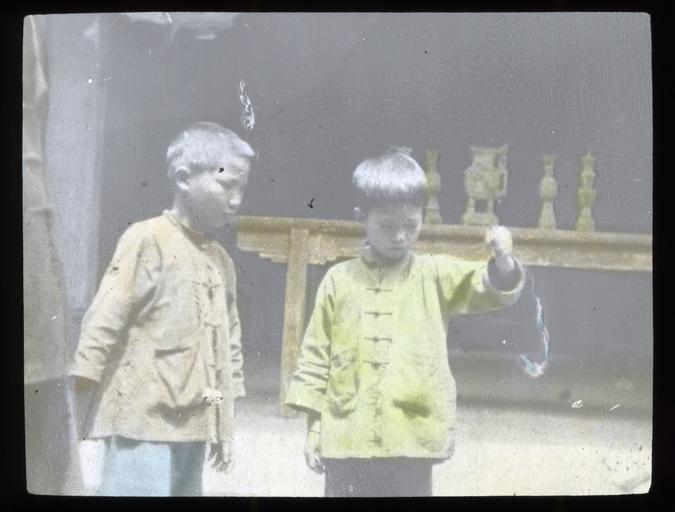 | Keywords: Boy playing with a toy, China, ca. 1918-1938 (MFB-LS0251).jpg en <br> Boy playing with a toy China ca 1918-1938 Colorized lantern slide of a boy playing with a toy He and his companion stand outdoors Behind them can be seen four objects sitting on a wood table Photographer Unknown Subject keyword boys; general views Filename MFB-LS0251 Coverage date 1918/1938 Subject unesco boys Part of collection International Mission Photography Archive ca 1860-ca 1960 Type images Part of subcollection Photographs of the Catholic Foreign Mission Society of America Maryknoll New York 1912-1945 Part of repository Maryknoll Mission Archives Repository name Maryknoll Mission Archives Archival file impa_Volume32/MFB-LS0251 tiff Repository address Maryknoll Mission Archives PO Box 305 Maryknoll N Y 10545-0305 Geographic subject country China Geographic subject continent Asia Rights http //www maryknollsociety org/index php/articles/2-articles/593 Repository email archives maryknoll org Date created 1918/1938 Publisher of the digital version University of Southern California Libraries Format aat lantern slides Legacy record ID impa-m60398 Access conditions http //www maryknollsociety org/index php/articles/2-articles/593 File MFB/LanternSlides/LS0251 1918/1938 author http //digitallibrary usc edu/cdm/ref/collection/p15799coll123/id/11294 PD-old-70-1923 Magic lantern images Images from USC Digital Library uploaded by Fæ International Mission Photography Archive ca 1860-ca 1960 Boys of China |