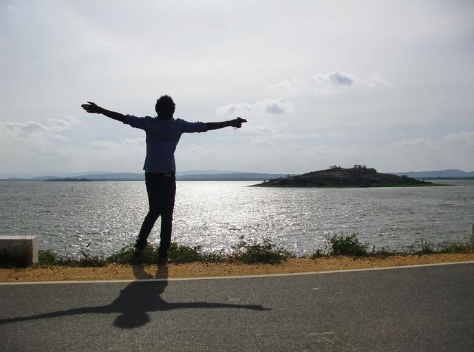 Keywords: boy silhouette male man arms outstretched happy joyful healthy enjoy freedom sky lake water roadside shadow lifestyle fun person joy happiness