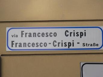 Keywords: Bozen 1 (140).JPG Bozen-Bolzano ” Francesco-Crispi-Straße Schild own 2011-05-24 07 47 08 User Mattes Commonist Street signs in Italy Signs in Bolzano Bilingual signs in Trentino-South Tyrol Taken with Sony DSC-HX5VN Work by Mattes 2011 User Mattes/Contributions/Topics/Italy/Bozen-Bolzano User Mattes/Contributions/Topics/banners coat of arms flags logos seals and signs |