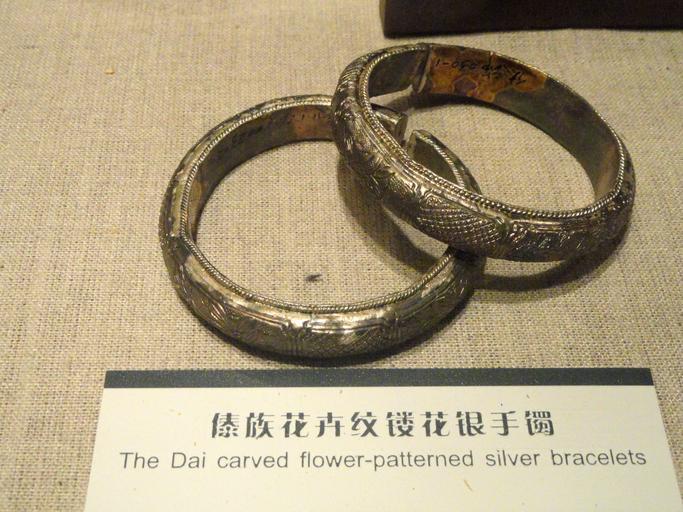 Keywords: Bracelet - Yunnan Nationalities Museum - DSC04191.JPG Dai silver bracelets Jewelry in the Yunnan Nationalities Museum Kunming Yunnan China I took this photograph 2011-08-13 02 02 51 Daderot Public domain Jewellery in the Yunnan Nationalities Museum Dai jewelry |
