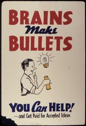 Keywords: Brains Make Bullets. You Can Help^ - NARA - 534246.jpg Scope and content General notes 534246 Local identifier 179-WP-397 Office for Emergency Management War Production Board 01/1942 - 11/03/1945 Still Picture Records Section Special Media Archives Services Division NWCS-S National Archives at College Park 8601 Adelphi Road College Park MD 20740-6001 other date circa 1942 1943 Record group Record Group 179 Records of the War Production Board 1918 - 1947 Record group ARC 508 War Production Board compiled 1942 - 1943 Series ARC 533858 File unit File unit ARC Variant control numbers NAIL Control Number NWDNS-179-WP-397 Other versions <gallery> File Brains_Make_Bullets _You_Can_Help _-_NARA_-_534246 tif tif File Brains_Make_Bullets _You_Can_Help _-_NARA_-_534246 jpg jpg </gallery> NARA-cooperation PD-USGov World War II posters from the United States