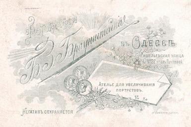 Keywords: Braunstein Odessa.jpg ru Паспа ту Фотог афия Б З Б аунштейна в Одессе Ришельевская ул 22 s 1900 - 1910s \ before 1917 Семейный а хив Г иго ия Ганзбу га Фишелес <gallery>File Nina Zähner jpg</gallery> PD-RusEmpire Uploaded with UploadWizard Photographers from Odessa Rishelievska Street |