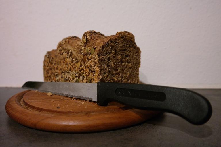 Keywords: bread whole wheat bread eat food healthy breakfast edible baked goods cores whole wheat dark bread grains organic bread wooden board knife board kitchen board