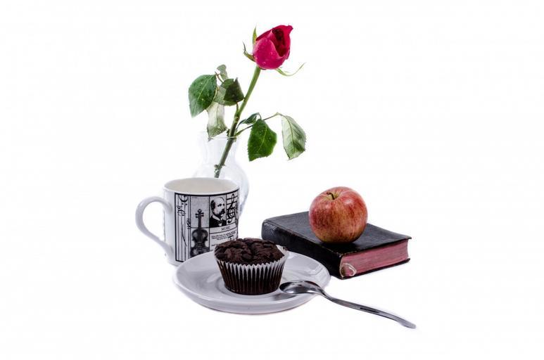 Keywords: breakfast food morning start energy rose flower apple book sweet coffee cup isolated white