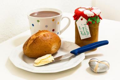 Keywords: breakfast roll jam cup knife butter cocoa eat weizenbroetchen cakes loaf crispy morning