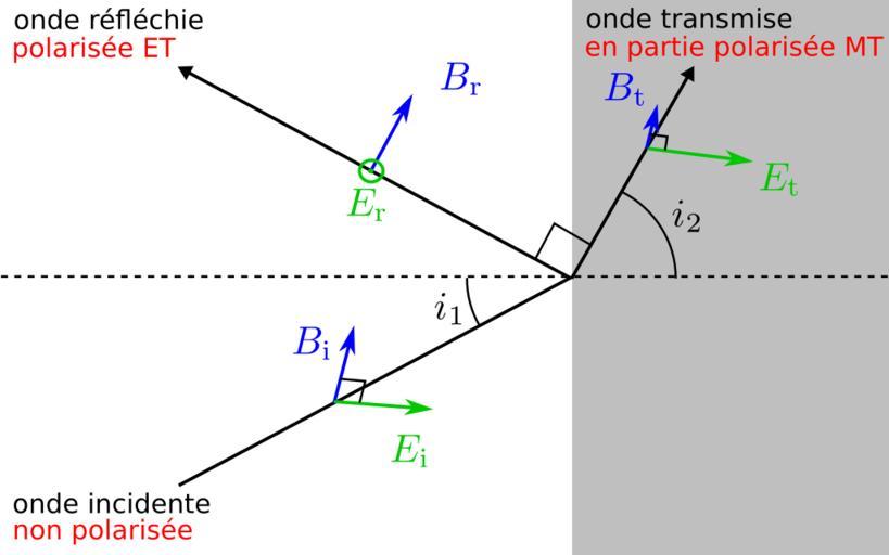 | Keywords: Brewsters-angle-sketch-fr.svg plane wave at the Brewster's angle unpolarised light is reflected as totally transverse electrical the transmitted beam is partially polarised in the transverse magnetical direction Are drawn and labelled incoming and refracting angles magnetic B and electric E fields the right angle between reflected and refracted waves onde plane à l'angle de Brewster la lumière polarisée est réfléchie avec une polarisation électrique transverse tandis que la lumière transmise est partiellement polarisée dans le sens magnétique transverse Sont indiqués les angles d'incidence et de réfraction les champs électriques E et magnétiques B l'angle droit entre l'onde réfléchie et l'onde réfractée own 2008-06-03 Brachycerophilia Brewster angle diagrams Created with Inkscape |
