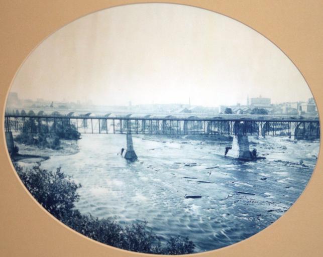 | Keywords: Bridge below St Anthony Falls.jpg Below St Anthony Falls at Henry Peter Bosse Views on the Mississippi exhibition Ramsey County Historical Society Landmark Center Saint Paul Minnesota Photo of a modern reproduction of a Bosse photo from a volume found by the U S Corps of Engineers aboard the Dredge William A Thompson Views on the Mississippi River from negatives taken and printed under the direction of Major A Meckenzie Corps of Engineers U S A by H Bossee Draughtsman 1883-1891 1891 Henry Peter Bosse PD-USGov Bridges over the Mississippi River at Minneapolis Iron truss bridges in Minnesota 19th-century bridges in Minnesota Demolished bridges in the United States Deck truss bridges in the United States Stone Arch Bridge Minneapolis |