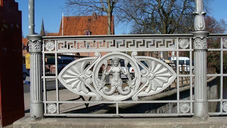 Keywords: Bridge Lüneburg 01.JPG Relief on Bridge own own photograph 06 03 2011 own own photograph Railing details of Ilmenaubrücke Altenbrückertorstraße Lüneburg Symbols from Lüneburg Wrought iron in Lower Saxony