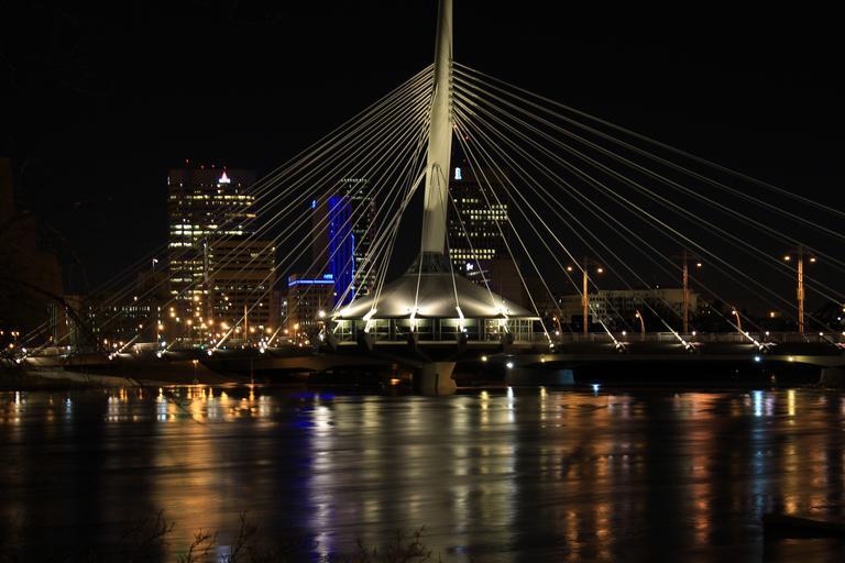 Keywords: bridge night water landmark city skyline cityscape river winnipeg red river architecture