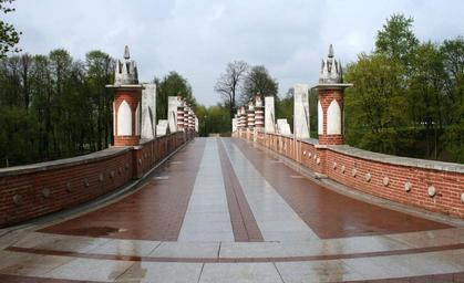 Keywords: bridge pedestrian wide red and white pillars lights wet surface shiny