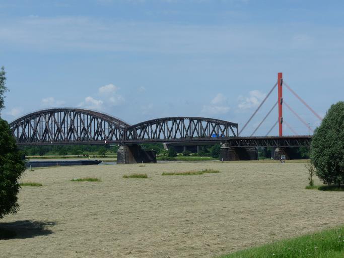 Keywords: bridge railway bridge arch bridge arch rhine niederrhein highway suspension bridge river landscape meadow rhine meadow pylon landscape hay
