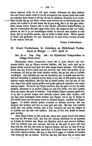 | Keywords: Briefwechsel Hildebrand Veckinchusen 106.jpg Hildebrand Veckinchusen Briefwechsel eines deutschen Kaufmanns im fünfzehnten Jahrhundert http //books google com/books 3fid 3d8chAAAAAIAAJ printsec 3dfrontcover dq 3dVeckinchusen hl 3dde century 14 Wilhelm Stieda Ed Author died more than 70 years ago - public domain PD-old Briefwechsel Hildebrand Veckinchusen |