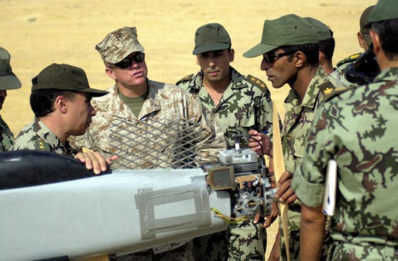 | Keywords: Bright Star 2005 DVIDS10358.jpg en WESTERN EGYPTIAN DESERT Sept 20 2005 - Marine Chief Warrant Officer 4 Thomas E Morris second from left ground-based air defense lead Marine Corps Systems Command gives a group of Egyptian Army officers a briefing on the MiG-23 Bandit the unmanned aerial vehicle used during the Marine Air Control Group 38 Detachment 13th Marine Expeditionary Unit's Stinger missile shoot in the Western Egyptian Desert The Cynthiana Ky native participated to Exercise Bright Star specifically to provide technical support for the lightweight fiberglass target drones used in the training The evolution allowed coalition forces from the host nation and the Netherlands to observe the equipment and procedures used by U S Marines to engage low-flying aircraft and met its goal of strengthening the bond between coalition forces as well as displaying a portion of the 13th Marine Expeditionary Unit Special Operations Capable 's warfighting capability 2005-09-27 https //www dvidshub net/image/10358 10358 2005-09-27 14 00 PD-USGov 13th Marine Expeditionary Unit Images from DoD uploaded by Fæ |