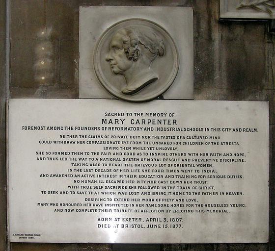 | Keywords: Bristol.cathedral.inscription.mary.arp.jpg The monument to Mary Carpenter 1807-1877 in Cathedral Bristol England In the mid-19th century the Bristol streets were full of homeless and destitute children 'on the border of a criminal or vagrant life ' Moved by their plight she looked after them and started schools Taken by Adrian Pingstone 2005 04 2005-04-02 according to EXIF data Taken by Adrian Pingstone Arpingstone mary-carpenter-relief jpg 51 27 6 N 2 36 2 5 W Plaques in the United Kingdom Education in the United Kingdom Church monuments in Bristol Cathedral Monuments and memorials in Bristol Monuments and memorials to homelessness |