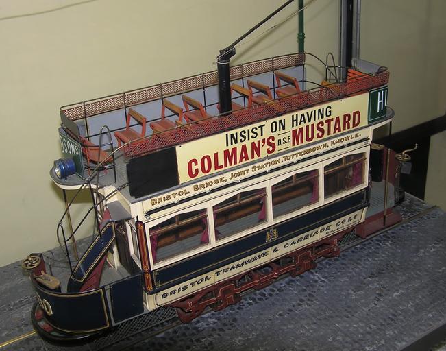 Keywords: Bristol tram model arp.jpg Please note to avoid repetition of the word Bristol all information and dates below are about City of Bristol trams only The information is from the signboard next to the model so should be accurate Scale model of an 1899 Bristol Tramways and Carriage Company Limited electric tram number 160 in the Industrial Museum Bristol England <br> Horse-drawn trams were introduced in 1875 but had a maximum speed of 6 mph <br> Electric trams were introduced in 1895 At the peak of their use in 1908 Bristol had 233 in the fleet running on 31 miles of track Electricity was picked up from overhead wires this tram had two GEC 27HP electric motors <br> Petrol buses started in 1906 but did not fully take over from trams until the final electric tram service ran in 1939 In 2007 the Bristol Industrial Museum was permanently closed for conversion to the Museum of Bristol The exhibits are in storage Photographed by Adrian Pingstone 2004-08 Photographed by Adrian Pingstone Arpingstone 51 26 51 9 N 2 35 52 7 W Bristol Tramways Colman's mustard Tram models from above |