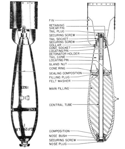 | Keywords: British 250lb General Purpose Bomb.png Diagram showing external and sectional view of British Mark 1 250lb General Purpose bomb British Explosive Ordnance Navy Department Bureau of Ordnance Washington DC NAVORD OP 1665 page 17 <br>Downloaded from http //www lexpev nl/downloads/britishexplosiveordnance1946 pdf 1946-06-10 Navy Department Bureau of Ordnance Washington DC PD-USGov British WW2 general purpose bombs Weapon schemas | ||||