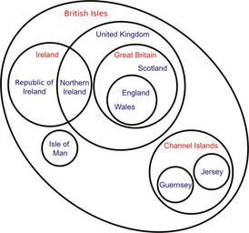 | Keywords: British Isles Venn Diagram-en.svg A scalable vector version of the British Isles Venn Diagram from Wikipedia http //en wikipedia org/wiki/Image British_Isles_Venn_Diagram png This version unlike the PNG version on Wikipedia features some small changes and improvements including referring to the Republic of Ireland as such instead of just Ireland Additionally the Ireland as in the island text is now in the middle It might not look that great but it's the best way to illustrate it Red text refers to geographical areas blue text refers to political entities To keep in tradition with the PNG image this image will additionally be released into the public domain Original version of the SVG by Messedrocker 2006-07-26 own assumed ScislaC Other Versions in Polish Subdivisions of the United Kingdom Euler diagrams Membership diagrams |