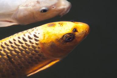 Keywords: brocade carp koi carp fish swim pond water white black gold orange cultivar japan japanese china wealth luck mirroring water surface