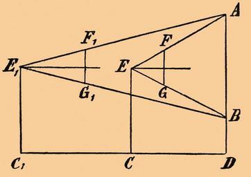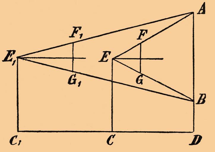 Keywords: Brockhaus-Efron Jacobstab 2.jpg ru Иллюст ация к статье Якобштаб из энциклопедии Б окгауза и Еф она Пусть высота изме яемого п едмета AB есть х; а длина меньшего сте жня; С пе вое положение наблюдателя когда меньший сте жень находился на n-ом делении большего; С1 вто ое положение наблюдателя когда меньший сте жень находился на n + 1-ом делении большего; b асстояние между обоими положениями; наконец у асстояние CD пе вого положения наблюдателя от п едмета Тогда на основании подобия т еугольников АЕВ и FEG AE1B и F1E1G1 можно написать соответственно п опо ции х а у па и х а у + b п + 1 a из кото ых следует что у пх и у + b n + 1 х а следовательно b х Для обеспечения необходимой п и ассмот енном изме ении го изонтальности большого сте жня Я к нижнему концу его меньшего сте жня п ивешивалась тяжесть Иоанн Региомонтан п иложил «Посох Якова» к аст ономическим изме ениям http //dic academic ru/dic nsf/brokgauz_efron/147056 ~ 1905 Б окгауз и Еф он PD-Brockhaus Efron Measurement Jacob's staff