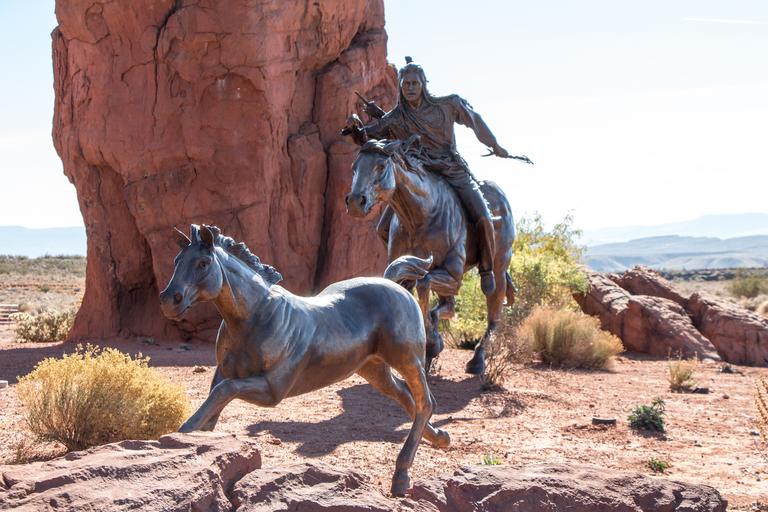 | Keywords: bronze sculpture native american west wild musting indian sculpture statue landmark travel monument culture city attraction symbol tourism history sky historic figure horse pony chase capture tame sandstone clay orange sand desert utah southern south |