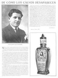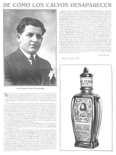 Keywords: Brotanil-Sevilla-1925-01-21-Mundo-Grafico.jpg es Brotanil Sevilla de como los calvos desapareceran El texto de la imagen es el siguiente De como los calvos desaparecen No mas calvos <- prometia en sus anuncios hace años un especifico para la curacion de la calvicie; però los calvos seguian sufriendo todas las molestias y perjuicios que ocasiona la falta de pelo y el ansiado producto que de una manera radical è infalible habia de terminar con la calvicie no aparecia por ninguna parte Pero en Sevilla habia un quimico a quien esta cuestion preocupaba y que encerrado en un Laboratorio multiplicaba las experiencias para lograr un remedio contra la calvicie però un remedio real de positivos resultados; y al fin tras de ensayos sin cuento surgiò el ansiado remedio; mas su autor el notable quimico don José Se villa Delgado receloso de su exito no quiso darle publicidad alguna y por espacio de cuatro años se dedicò a comprobar los efectos de su preparado y solo ad observar los costantes exitos en todos los casos y ante las reiteradas instancias de amigos y personas que à el debian haber recobrado el cabello de otro tiempo se decidiò à lanzar el produco al mercato registrandolo bajo el nombre de BROTANIL SEVILLA La aceptacion obtenida por el BROTANIL fue extraordinaria tan extraordinaria como su accion contra la calvicie Si todavia admitimos los milagros forzoso serà considerar el BROTANIL como milagroso ¦ Un rasgo simpatico que carateriza al Sr Sevilla y que lo muestra tambien dotado de un fino espiritu moderno de ombre de negocio ha sido poner al BROTANIL un precio de venta al alcance de todos cinco pesetas al frasco Con esto quiere facilitar el Sr Sevilla la adquisicion del BROTANIL a todos los escepticos y desconfiados para que asì puedan comprobar personalmente la eficacia de su producto; pero claro que ese precio verdaderamente excepctional solo piensa mantenerlo con el fin enunciado durante los cuatro primeros meses de este año y luego elevarlo considerablemente pues ni las primeras materias que entran en la composicion del BROTANIL ni la elaboracion envase y envoltura esta ultima prov visoria permiten vender el producto à cinco pesetas cantidad que ni siquiera cubre gastos Para dar idea del exito del BROTANIL SEVILLA podriamos publicar cartas y fotografias de clientes agradecidos; pero tanto se ha usado y abusado de estas pruebas documentales que podria parecer que tratabamos de realizar una propaganda ya muy desacreditada Otro datos no menos eloquente del exito franco y rapido del BROTANIL es el hecho de que habiendose vendido doscientos cinquanta mil frascos en poco mas de un mes actualmente tiene el señor Sevilla pedidos en firme de otros tantos frascos Tambien patentiza el exito del ilustre quimico el que se le hayan hecho ya distintas ofertas para adquirir la formula registrada ofertas que desde luego ha desdeñado incluso una de medio millon de pesetas No cabe duda que al fin se ha dado con la formula tan perseguida; pues los cuatro años de pruebas felices garantizan la eficacia del BROTANIL SEVILLA y todos aquellos que padecen la enojosa enfermedad de la calvicie en cualquiera de sus grados pueden confiar en su curacion radical y absoluta El BROTANIL se encuentra en todas las farmacias perfumerias y droguerias al indicado precio de cinco pesetas; però si en alguna localidad no se halla puede pedirse directamente al Laboratorio BROTANIL SEVILLA calle de O ™Donnell 26 Sevilla remitiendo seis pesetas veinticinco centimos por giro postal y lo recibiran franco de portes Felicitamos pues muy sinceramente al Sr Sevilla por el exito rotundo alcanzado; pero por muy sinceras que nuestras felicitaciones sean mucho mas sinceras y calurosas seran las que le prodiguen los calvos al apreciar la maravillosa eficacia del BROTANIL en sus craneos despoblados B ROMERO Sevilla Enero 1925 1925-01-21 Mundo Grafico 21 1 1925 pag 9 B Romero PD-old Brotanil Sevilla Mundo Gráfico advertisements 1925 advertisements in Spain 1925 in Andalusia 21 January