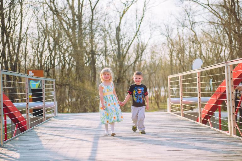 Keywords: brother sister fun walk bridge boy girl female male daughter son kid together child people family young childhood smiling person summer cheerful little cute holding hands