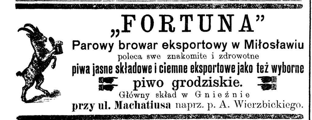 Keywords: Browar Fortuna. Skład w Gnieźnie, reklama w Lechu- Gazecie Gnieźnieńskiej, 1897 .jpg pl Reklama gnieźnieńskiego sklepu firmowego Browaru Fortuna Sklep mieścił się przy Machatiusstrasse od 1919 r - ul S Moniuszki W ofercie ze stycznia 1897 r m in piwo grodziskie Lech Gazeta Gnieźnieńska 1897 nr 7 10 01 1897 author 1897 Gniezno in 1890s Economy of Gniezno Miłosław Breweries in Poland Fortuna beer Anonymous-EU |