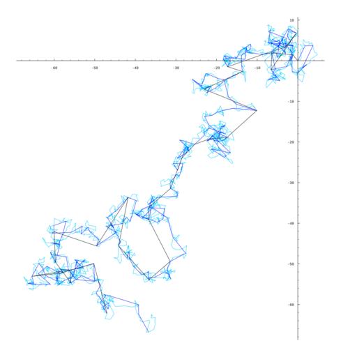 | Keywords: Brownian hierarchical.svg An image of Brownian motion done with three different step sizes The hierarchical structure is clearly visible Vector version of Image Brownian_hierarchical png made using Mathematica Mathematica code <pre> g last 0 0 Dog Appendg last last + Sqrt-LogRandom Cosθ Sinθ / θ -> RandomReal 2Ï 2048 g2 Partitiong 8All 1; g3 Partitiong2 8All 1; plot Show ListPlotg PlotJoined -> True PlotStyle -> RGBColor0 78 1 DisplayFunction -> Identity ListPlotg2 PlotJoined -> True PlotStyle -> Blue DisplayFunction -> Identity ListPlotg3 PlotJoined -> True DisplayFunction -> Identity DisplayFunction -> DisplayFunction AspectRatio -> Automatic ImageSize -> 1000 </pre> Brownian motion Images with Mathematica source code |
