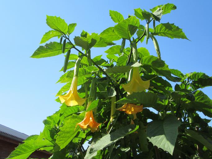 MAKE A MEME View Large Image brugmansia flowers nightshade yellow flower bloom yellow flower nature yellow flowers blue sky in bloom flourish garden