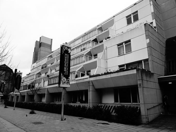 | Keywords: blackandwhite monochrome outdoor building architecture road building complex black and white It was designed by Patrick Hodgkinson[2] in the mid-1960s, based on studies by Leslie Martin.[3] It was initially planned as a private development at a time when private, mixed-use development in the UK was rare. Building started in 1967 and was completed in 1972, though the building fell some way short of its intended size. The original plan extended up to Euston Road but the Ministry of Defence would not release the site of a building they leased for use by the Territorial Army (and that still stands next to the Centre today)[citation needed].   After failing to attract sufficient private buyers on time, the residential section was leased to the London Borough of Camden for use as council housing, while the developer retained ownership of the structure and shopping areas. The exterior of the building was never painted because the Borough could not afford to complete work on the building after they took control. In Hodgkinson's design, the blocks would have been painted cream, a shade typical of the Georgian period, as a homage to the terraced houses that previously stood on the site and those that still surround it.   Despite being widely disliked by those who are unsympathetic to modernist architecture, it achieved Grade II status in 2000. By this time, however, many of its shop premises were unoccupied. Plans for renovation had repeatedly been blocked by residents' committees but in November 2002, the £22 million project began. This included the painting of the blocks in their originally-planned colour and the commissioning of artist Susanna Heron to introduce water features to the central space.[4][2] The major work was completed in late 2006 with the opening of branches of several high street chain stores and restaurants. The dual management has caused problems though, as the landlord restored the structure of the estate but the council is responsible for maintenance of the residential properties - so while the concrete structure was restored, the windows remained untouched, detracting from the overall aesthetic of the development. In 2007, the council started work on replacing the windows that has resulted in the residents having scaffolding outside their flats for the second time in just a few years.   Now referring to itself as The Brunswick, the centre contains 560 flats, various shops, cafés and restaurants, a Waitrose supermarket, and the Renoir Cinema (one of London's Curzon Cinemas group). It was designed by Patrick Hodgkinson[2] in the mid-1960s, based on studies by Leslie Martin.[3] It was initially planned as a private development at a time when private, mixed-use development in the UK was rare. Building started in 1967 and was completed in 1972, though the building fell some way short of its intended size. The original plan extended up to Euston Road but the Ministry of Defence would not release the site of a building they leased for use by the Territorial Army (and that still stands next to the Centre today)[citation needed].   After failing to attract sufficient private buyers on time, the residential section was leased to the London Borough of Camden for use as council housing, while the developer retained ownership of the structure and shopping areas. The exterior of the building was never painted because the Borough could not afford to complete work on the building after they took control. In Hodgkinson's design, the blocks would have been painted cream, a shade typical of the Georgian period, as a homage to the terraced houses that previously stood on the site and those that still surround it.   Despite being widely disliked by those who are unsympathetic to modernist architecture, it achieved Grade II status in 2000. By this time, however, many of its shop premises were unoccupied. Plans for renovation had repeatedly been blocked by residents' committees but in November 2002, the £22 million project began. This included the painting of the blocks in their originally-planned colour and the commissioning of artist Susanna Heron to introduce water features to the central space.[4][2] The major work was completed in late 2006 with the opening of branches of several high street chain stores and restaurants. The dual management has caused problems though, as the landlord restored the structure of the estate but the council is responsible for maintenance of the residential properties - so while the concrete structure was restored, the windows remained untouched, detracting from the overall aesthetic of the development. In 2007, the council started work on replacing the windows that has resulted in the residents having scaffolding outside their flats for the second time in just a few years.   Now referring to itself as The Brunswick, the centre contains 560 flats, various shops, cafés and restaurants, a Waitrose supermarket, and the Renoir Cinema (one of London's Curzon Cinemas group).  |