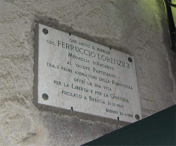 Keywords: BS-Bienno-plaques-001.jpg it BS Bienno lapide in memoria del partigiano col Ferruccio Lorenzini own Albertomos 2009 nessuna La targa recita QUI ABITO ™ IL RIBELLE COL FERRUCCIO LORENZINI MEDAGLA D ™ARGENTO AL VALORE PARTIGIANO TRA I PRIMI ANIMATORI DELLA RESISTENZA OFFRI ™ LA SUA VITA PER LA LIBERTA ™ E PER LA GIUSTIZIA FUCILATO A BRESCIA 31-12-1943 BIENNO 25 4 1969 ImageNote 1 432 267 1010 1013 1864 1552 2 <center> QUI ABITO ™ IL RIBELLE COL FERRUCCIO LORENZINI MEDAGLIA D ™ARGENTO AL VALORE PARTIGIANO TRA I PRIMI ANIMATORI DELLA RESISTENZA OFFRI ™ LA SUA VITA PER LA LIBERTA ™ E PER LA GIUSTIZIA FUCILATO A BRESCIA 31-12-1943 BIENNO 25-4-1969 </center> ImageNoteEnd 1 Antifascist plaques in Bienno Ferruccio Lorenzini |