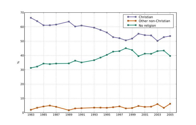 Keywords: Bsa-religion-question-1983-2005.svg en wikipedia 2009 April 11 en Time series of responses to British Social Attitudes question Do you regard yourself as belonging to any particular religion IF YES Which IF 'Christian' PROBE FOR DENOMINATION Results for all non-Christian religions have been combined Data Year 1983 1984 1985 1986 1987 1989 1990 1991 1993 1994 1995 1996 1997 1998 1999 2000 2001 2002 2003 2004 2005 Christian 66 31 63 97 61 08 61 11 61 57 63 68 60 22 60 92 59 42 57 8 56 05 52 8 52 05 50 54 51 77 55 18 54 18 53 99 50 14 52 79 53 55 Other non-Christian 1 99 3 41 4 32 4 93 4 08 1 7 2 93 3 13 3 48 3 48 3 39 3 79 4 39 2 98 3 23 4 66 4 00 4 17 5 99 3 33 6 19 No religion 31 28 32 2 34 29 33 95 34 32 34 41 36 34 35 08 36 68 38 49 40 38 42 66 43 02 45 06 43 75 39 5 41 22 41 11 43 04 43 4 39 63 Ref/NA 0 35 0 45 0 31 0 03 0 09 0 17 0 5 0 78 0 43 0 2 0 18 0 79 0 52 1 36 1 2 0 59 0 66 0 72 0 82 0 49 0 6 Data from the British Social Attitudes Survey http //www britsocat com/BodySecure aspx control BritsocatMarginals var RELIGION SurveyID 221 Created with Matplotlib Made using matplotlib with this python program <source lang python > /usr/bin/env python from pylab import rc 'font' family 'sans-serif' rc 'figure' figsize 12 8 t 1983 1984 1985 1986 1987 1989 1990 1991 1993 1994 1995 1996 1997 1998 1999 2000 2001 2002 2003 2004 2005 seriesChristian 66 31 63 97 61 08 61 11 61 57 63 68 60 22 60 92 59 42 57 8 56 05 52 8 52 05 50 54 51 77 55 18 54 18 53 99 50 14 52 79 53 55 seriesOther 1 99 3 41 4 32 4 93 4 08 1 7 2 93 3 13 3 48 3 48 3 39 3 79 4 39 2 98 3 23 4 66 4 00 4 17 5 99 3 33 6 19 seriesNone 31 28 32 2 34 29 33 95 34 32 34 41 36 34 35 08 36 68 38 49 40 38 42 66 43 02 45 06 43 75 39 5 41 22 41 11 43 04 43 4 39 63 seriesNA 0 35 0 45 0 31 0 03 0 09 0 17 0 5 0 78 0 43 0 2 0 18 0 79 0 52 1 36 1 2 0 59 0 66 0 72 0 82 0 49 0 6 red-green colourblind friendly plot t seriesChristian 's-' lw 3 color ' 7570b3' plot t seriesOther 's-' lw 3 color ' d95f02' plot t seriesNone 's-' lw 3 color ' 1b9377' ylabel ' ' axis 1982 2006 0 70 xticks arange 1983 2006 2 legend 'Christian' 'Other non-Christian' 'No religion' 'upper right' grid True savefig 'bsa-religion-question-1983-2005 svg' </source> Transferred from http //en wikipedia org en wikipedia; transferred to Commons by User Drilnoth using http //tools wikimedia de/~magnus/commonshelper php CommonsHelper 2008-02-24 Original uploader was Duncan Keith at http //en wikipedia org en wikipedia Released into the public domain by the author en wikipedia Duncan Keith Original upload log page en wikipedia Bsa-religion-question-1983-2005 svg 2008-02-24 08 37 Duncan Keith 862×551× 35718 bytes <nowiki>Corrected 'Other non-Christian' data Redone in matplotlib to fix legend rendering issue</nowiki> 2007-10-19 16 05 Duncan Keith 1300×780× 82685 bytes <nowiki>Legend fixed </nowiki> 2007-10-19 15 52 Duncan Keith 1300×780× 82892 bytes <nowiki>Time series of responses to British Social Attitudes question Do you regard yourself as belonging to any particular religion IF YES Which IF 'Christian' PROBE FOR DENOMINATION </nowiki> Religion in the United Kingdom SVG charts in English Images with Python source code