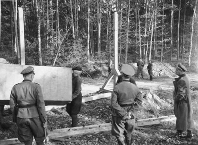 Keywords: Buchenwald Forced Labor Gallows 13137.jpg SS officers supervising the building of a gallows in the forest near Buchenwald concentration camp Buchenwald Thuringia Germany 1938-1940 http //www ushmm org/ United States Holocaust Memorial Museum courtesy of Robert A Schmuhl PD-USGov Buchenwald forced labor Buchenwald gallows Buchenwald concentration camp personnel Buchenwald executions Images from the United States Holocaust Memorial Museum Buchenwald Prisoners Monument |