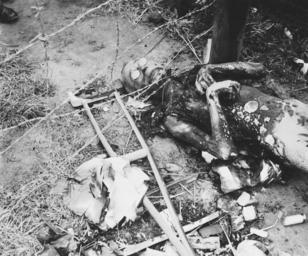 Keywords: Buchenwald Leipzig-Thekla Corpse 74978.jpg View of a badly burned corpse lying next to a barbed wire fence in the Leipzig-Thekla sub-camp The man's glasses are still on him and a crutch lies next to him Leipzig-Thekla Germany April 1945 http //www ushmm org/ United States Holocaust Memorial Museum courtesy of Rebecca Tran PD-USGov Holocaust victims People and barbed wire Crutches Buchenwald Leipzig-Thekla concentration camp Images from the United States Holocaust Memorial Museum |
