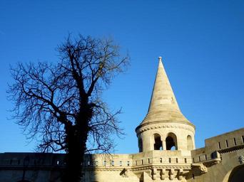 Keywords: budapest buda castle area fishermen's bastion wood light shadow blue sky tower