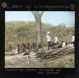 | Keywords: Building a New School, Malawi, (s.d.) (imp-cswc-GB-237-CSWC47-LS5-1-027).jpg en <br> Building a New School Malawi s d Measuring timber to build an out school Photograph of a group possibly of the Ngoni people during the construction of a school The missionary Dr Robert Laws can be seen standing in the centre of a group who are seated on the ground There are piles of stripped logs on the ground and two dogs can be seen in the photograph ; This belongs to a series of Church of Scotland Foreign Missions Committee lantern slides relating to Dr Robert Laws 1851-1934 the Scottish Missionary In 1875 inspired by David Livingstone 1813-1873 Laws travelled to Malawi and was involved in the foundation of the mission station of Livingstonia on the shores of Lake Nyasa During the succeeding 50 years he also established a network of hundreds of schools In 1908 Laws was elected moderator of the General Assembly of the United Free Church of Scotland Photographer Unknown Subject personal name Laws Robert 1851-1934 Filename imp-cswc-GB-237-CSWC47-LS5-1-027 tif Coverage date 1875/1925 Part of collection International Mission Photography Archive ca 1860-ca 1960 Type images Part of subcollection Photographs from the Centre for the Study of World Christianity University of Edinburgh U K ca 1900-ca 1940s Repository name Centre for the Study of World Christianity Archival file impaunpub_Volume7/1530 url Repository address The University of Edinburgh School of Divinity New College Mound Place Edinburgh EH1 2LX United Kingdom Geographic subject country Malawi Format aacr2 1 lantern slide 8 x 8 cm Geographic subject continent Africa Rights Contact the repository for details Part of series Laws of the Pioneer LS5/1 Repository email divinity-CSWC ed ac uk Subject lcsh Keyword School buildings; Building; Village communities Date created 1875/1925 Publisher of the digital version University of Southern California Libraries Subject aat genre group portraits Format aat lantern slides Legacy record ID impa-m68588 Access conditions http //www ed ac uk/schools-departments/divinity/research/centres/world-christianity/collections-resources File GB 237 CSWC47/LS5/1/27 1875/1925 author http //digitallibrary usc edu/cdm/ref/collection/p15799coll123/id/64651 PD-old-70-1923 Magic lantern images Images from USC Digital Library uploaded by Fæ International Mission Photography Archive ca 1860-ca 1960 |