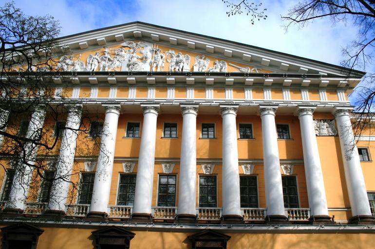 Keywords: building yellow historic architecture pediment frieze triangular relief art pillars white sky