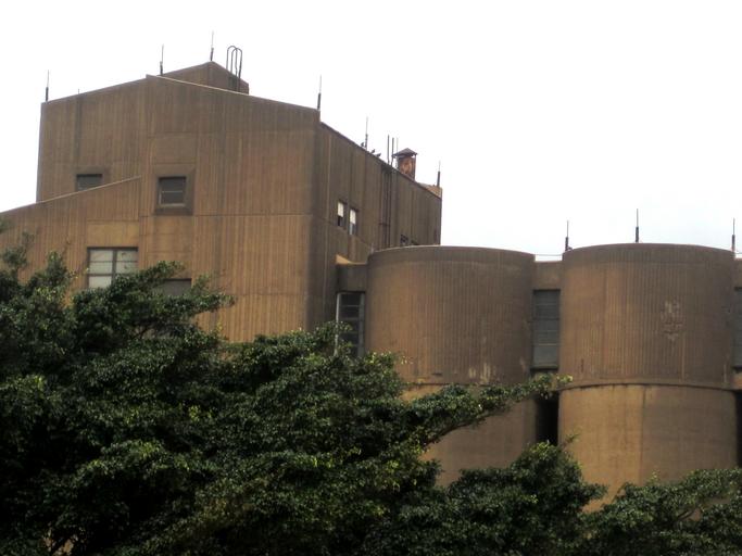 Keywords: buildings industrial brown dirty green trees contrast nature versus concrete sky cilidrical shapes geometrical shapes